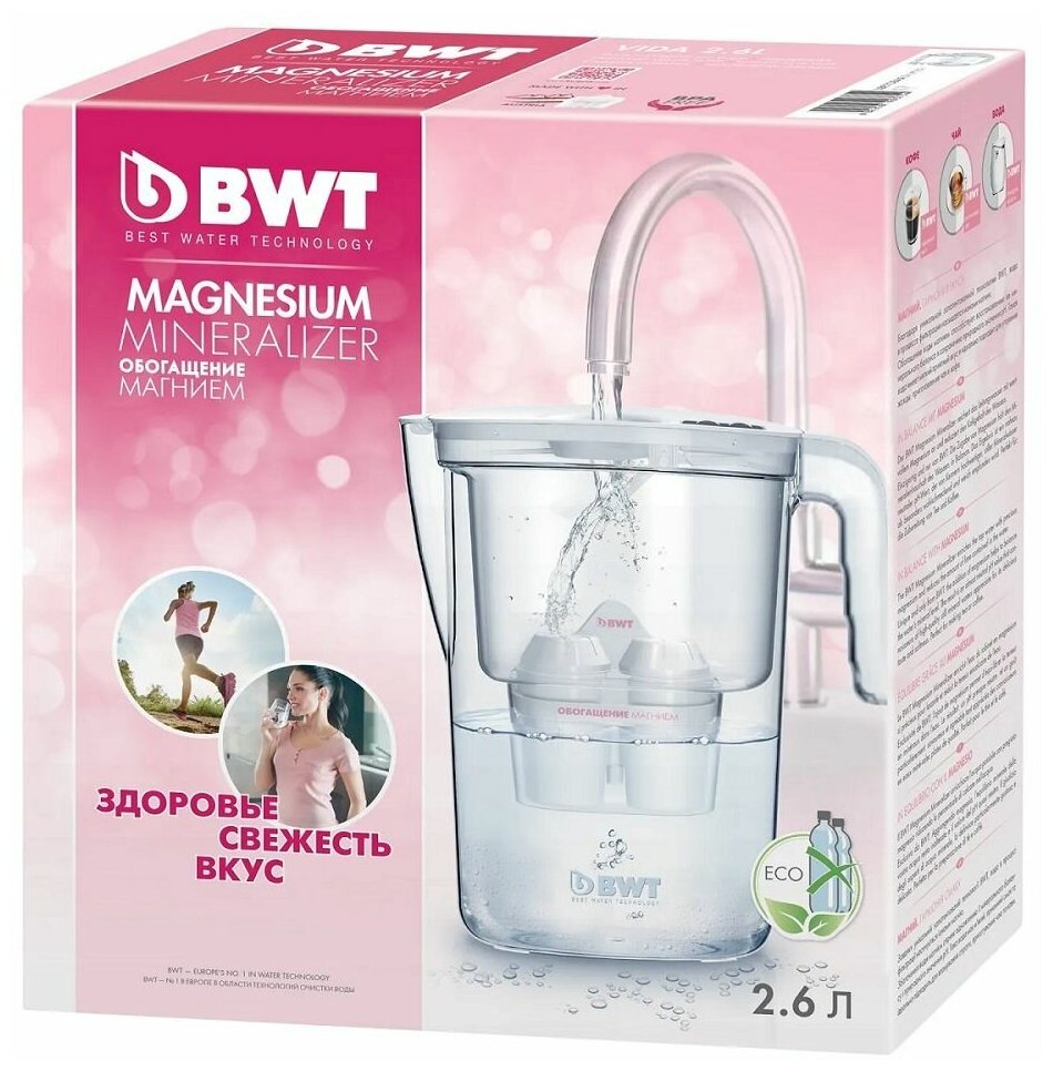 Фильтр-кувшин для воды розовый BWT VIDA 2,6 л с 1 картриджем Magnesium Mineralized Water/ Минерализация Магнием