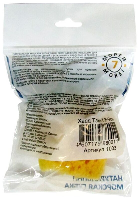Губка 7 морей, натуральная морская, Хард Тайп, жесткая, размер (от 7.6 до 8.9 см), в пакете. информация: