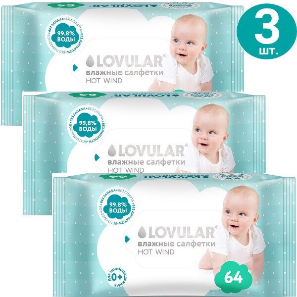 Влажные салфетки детские Lovular HOT WIND, 3 упаковки по 96 шт
