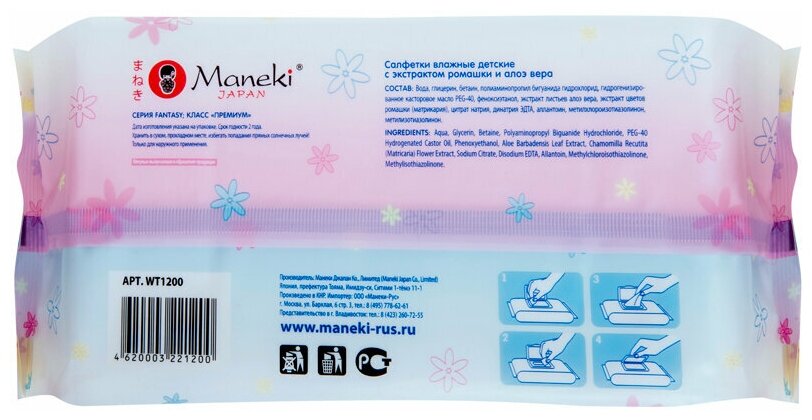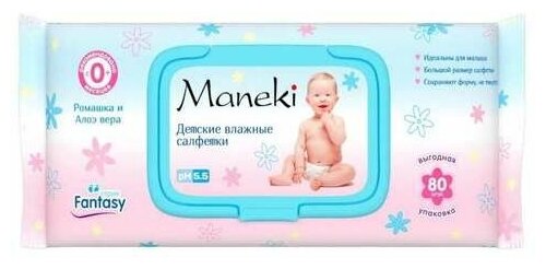 Maneki fantasy салфетки влажные, детские с экстрактом ромашки и алоэ вера, 80 шт.