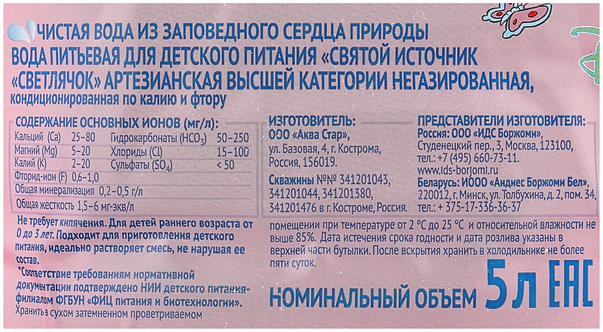 Вода питьевая для детского питания Святой Источник "Светлячок" артезианская высшей категории негазированная, 5л