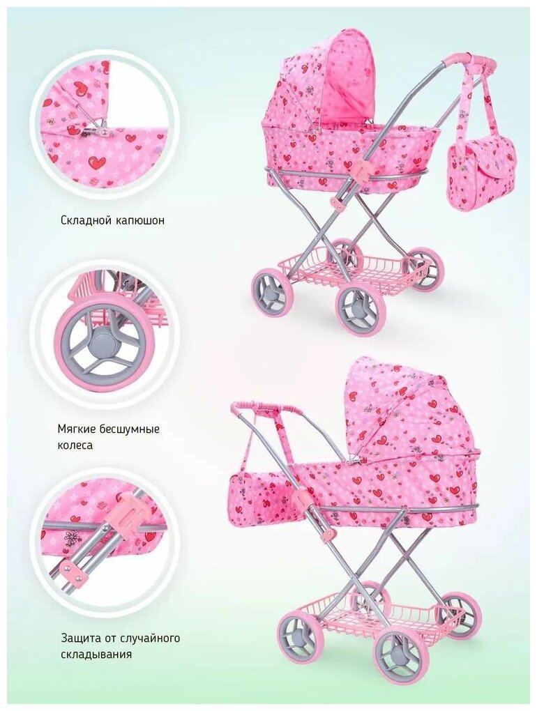 Коляска для куклы Buggy Boom Mixy регулируемый капюшон, сумка, сетка для игрушек, сердечки 69*40*80 см 8019-M2010