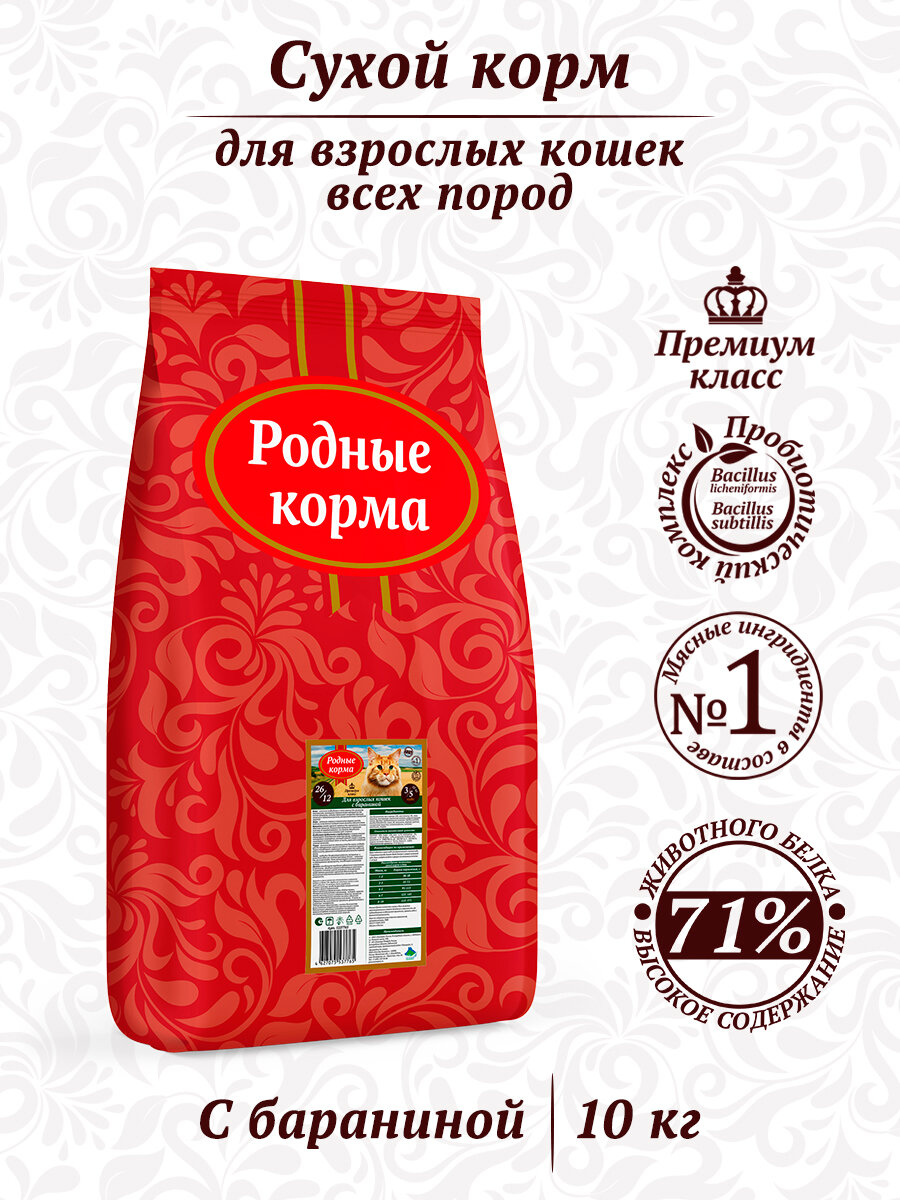 Сухой корм родные корма для взрослых кошек с бараниной 10кг