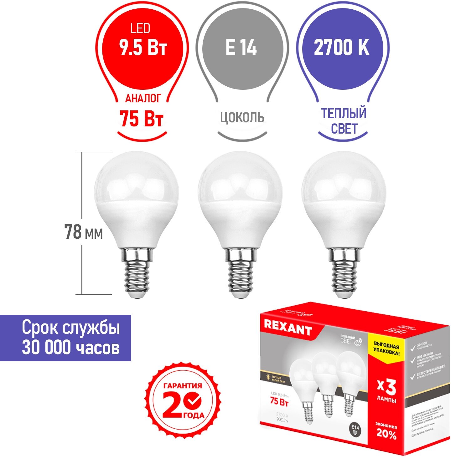 Светодиодная лампа Rexant Шар E14, 9.5 Вт, 903 Лм (=75 Вт), 2700 K (теплый свет), упаковка 3 шт.