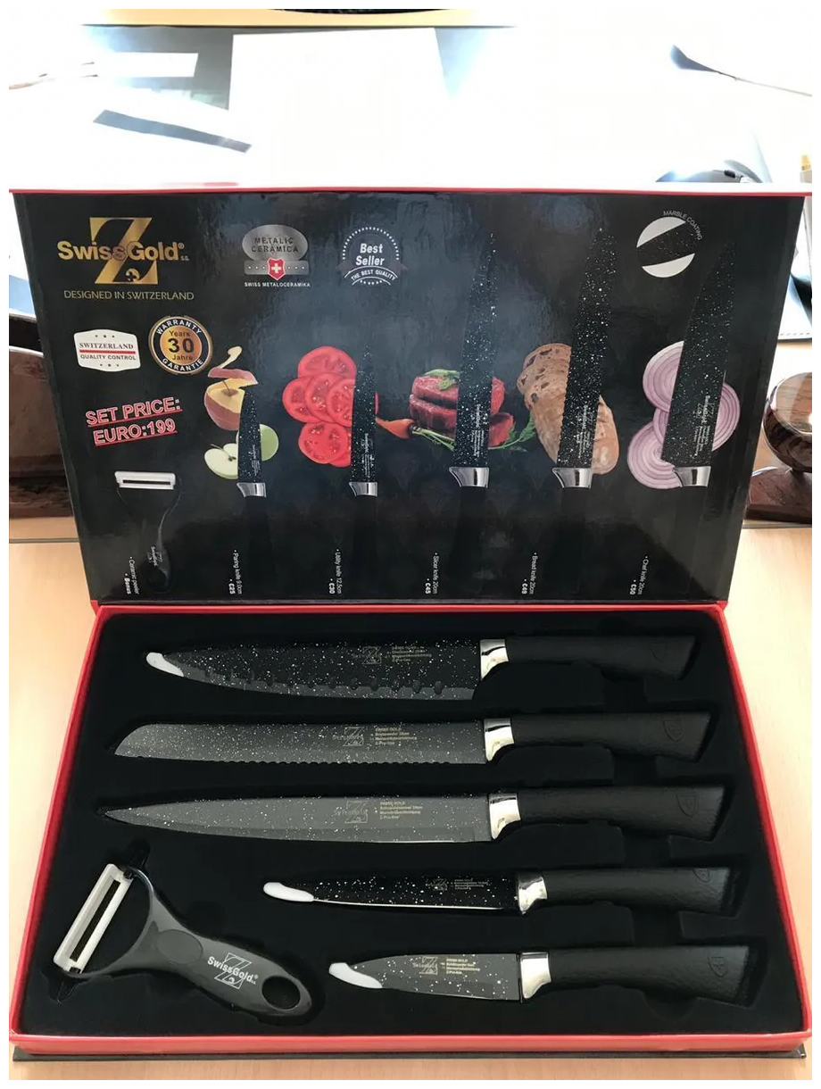 | Комплектация | Нож поварской: длина лезвия 20 см; толщина 1.8 мм Нож кухонный для нарезки: длина лезвия 20 см; толщина 1.8 мм Нож для хлеба: длина лезвия 20 см; толщина 1.8 мм Нож универсальный: длина лезвия 12.5 см; толщина 1.2 мм Нож для чистки овощей: 9 см; толщина 1.2 мм Овощечистка Подарочная упаковка. |