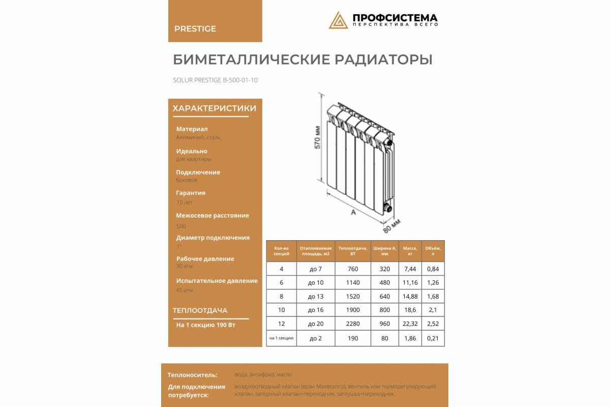 Solur PRESTIGE Радиатор отопления биметаллический 10 секций BMET10 информация: