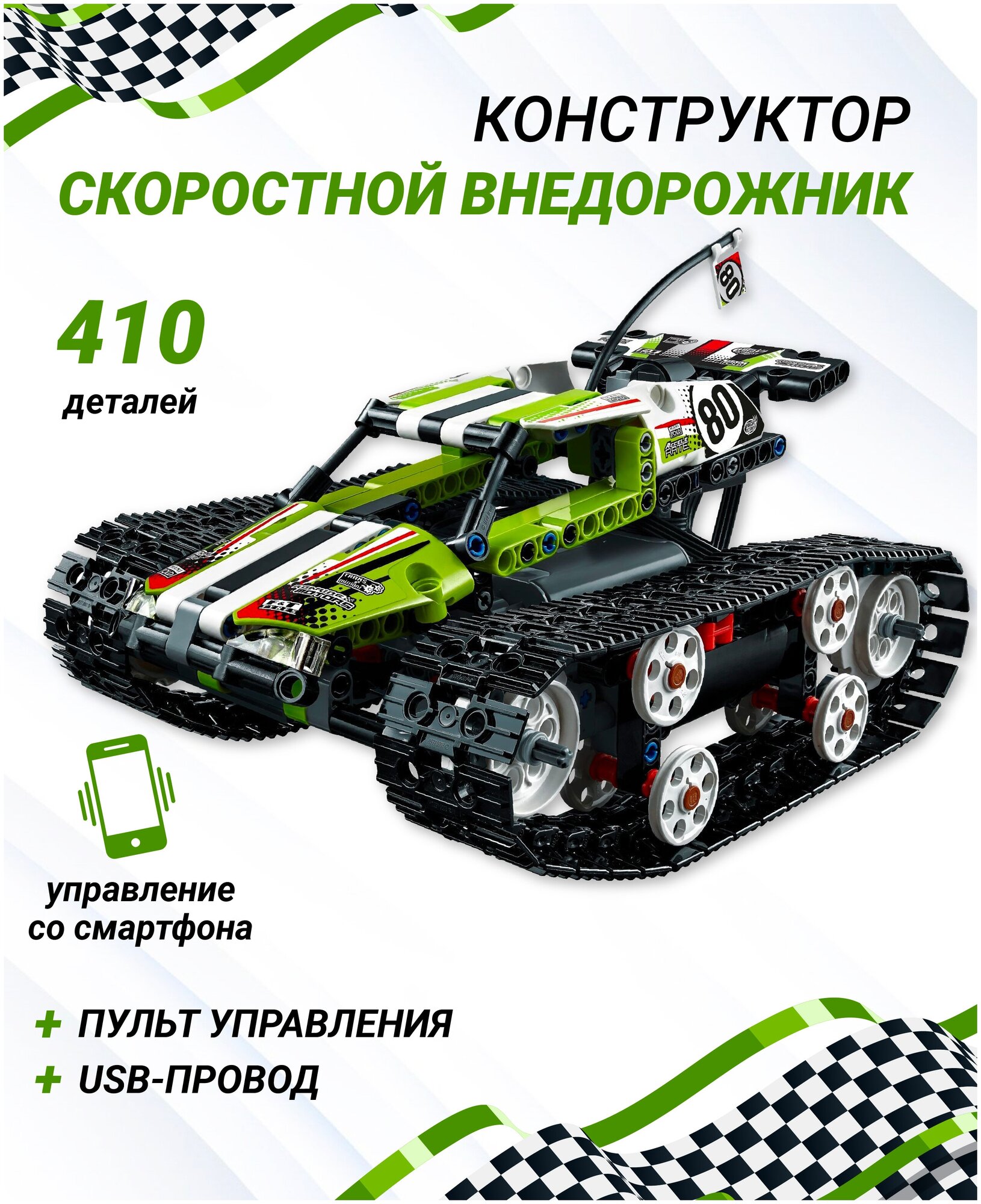| Комплектация | Аккумуляторная батарея: Li-ion / 3,7в / 220мАч., Сборная модель гусеничного скоростного вездехода, пульт дистранционного управления, 410 деталей |