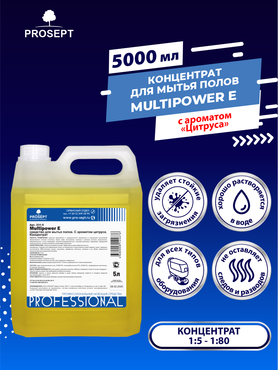Средство для мытья полов PROSEPT Multipower E цитрус концентрат 5 литров