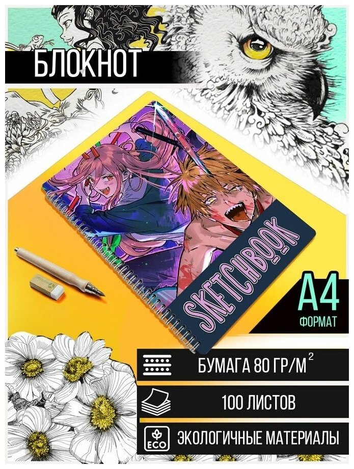 10 цен на Скетчбук Блокнот, A4 50 листов с деревянной обложкой аниме Chainsaw Man- 3126