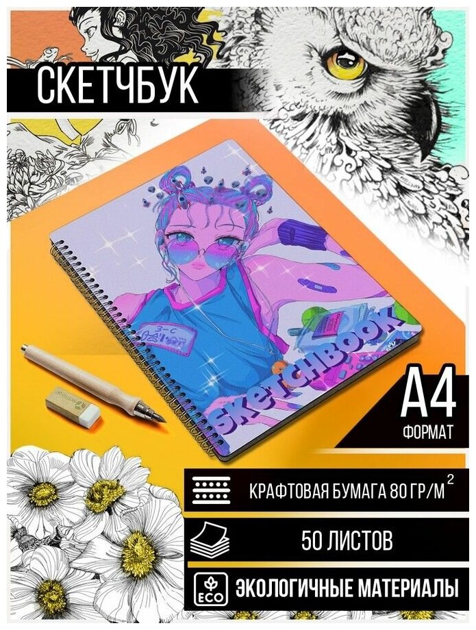 10 цен на Скетчбук, Блокнот, A4 50 крафт листов Девушка - 2184