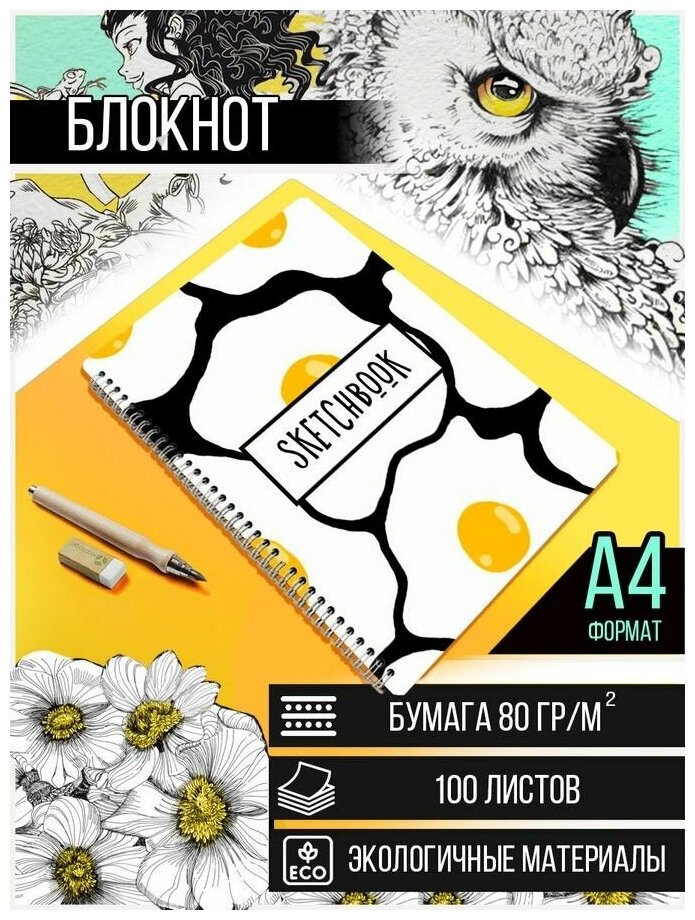 10 цен на Скетчбук Блокнот, A4 50 листов с деревянной обложкой принт Яичница (милота, завтрак) - 3114