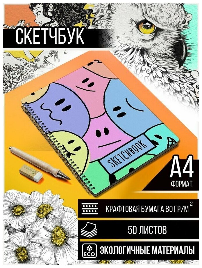 10 цен на Скетчбук, Блокнот, A4 50 крафт листов Смайл - 3103