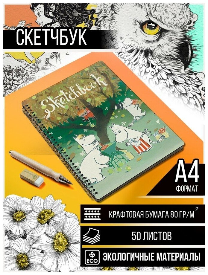10 цен на Скетчбук, Блокнот, A4 50 крафт листов муми тролли - 1084