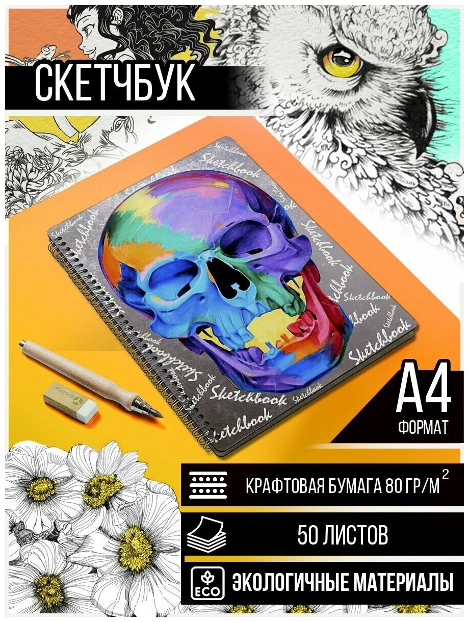 10 цен на Скетчбук, Блокнот, A4 50 крафт листов Красочный череп - 136
