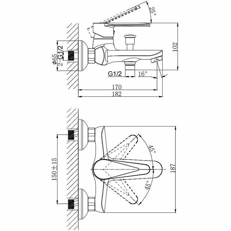 Смеситель на раковину настенный Эверест B46-350 с круглым поворотным изливом, кран-буксы 1/2", хром