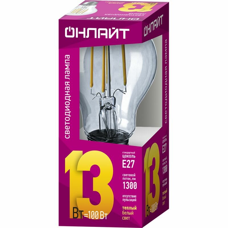 Лампа светодиодная филаментная 80 876 OLL-F-A60-13-230-2.7K-E27 13Вт грушевидная прозрачная 2700К тепл. бел. E27 1300лм 220-240В онлайт 80876 информация: