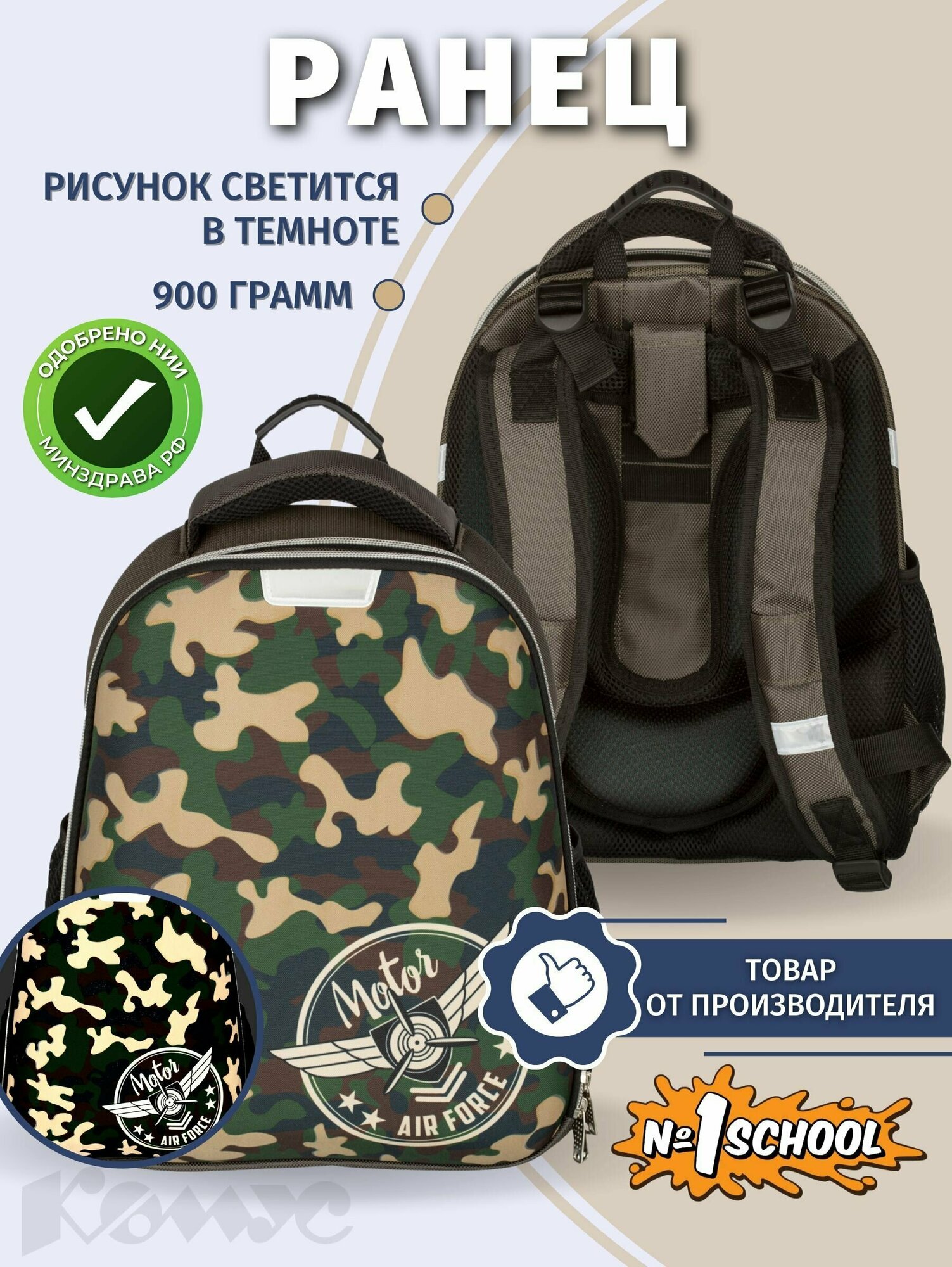 Ранец №1School Basic Military, 2 отд., ортопед. cпинка информация: