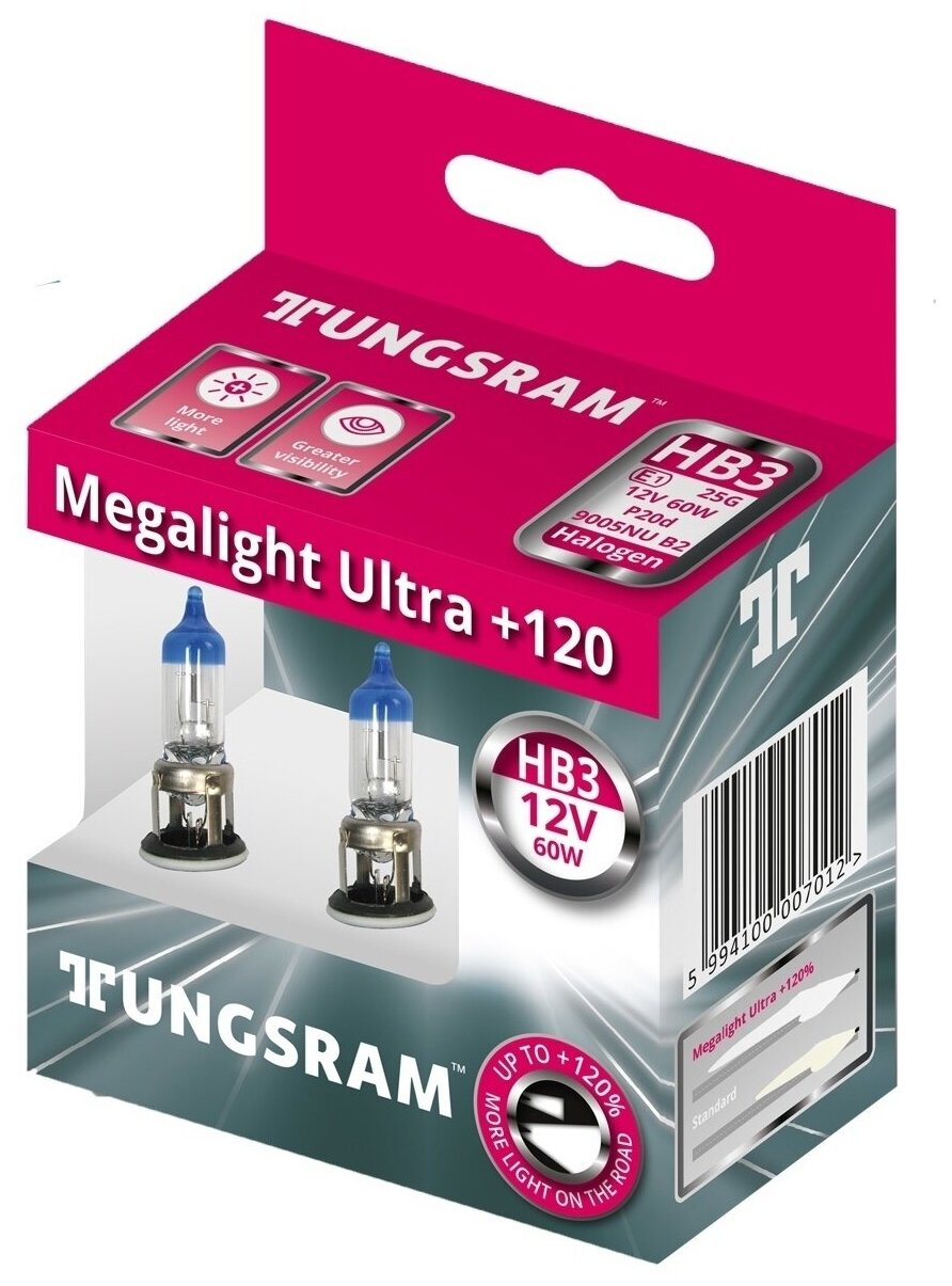 10 цен на Лампы TUNGSRAM "Megalight Ultra +120", HB3, +120%, 12V, 60W, P20d, 3200K, комплект 2 шт.