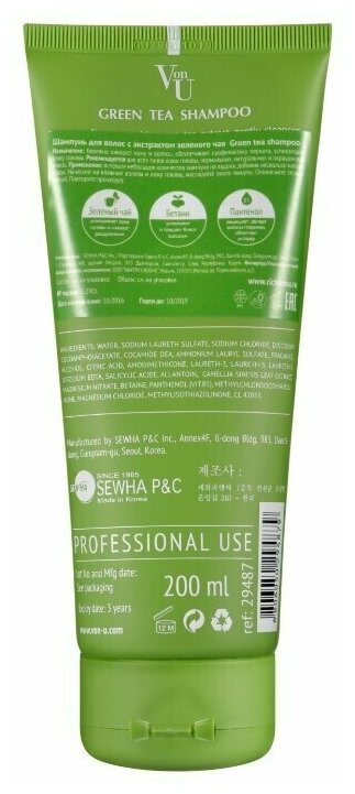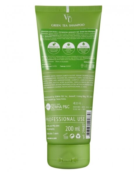 Шампунь для волос Корея / Для нормальной кожи головы и окрашенных волос / Green Tea Shampoo Von-U 200 мл информация: