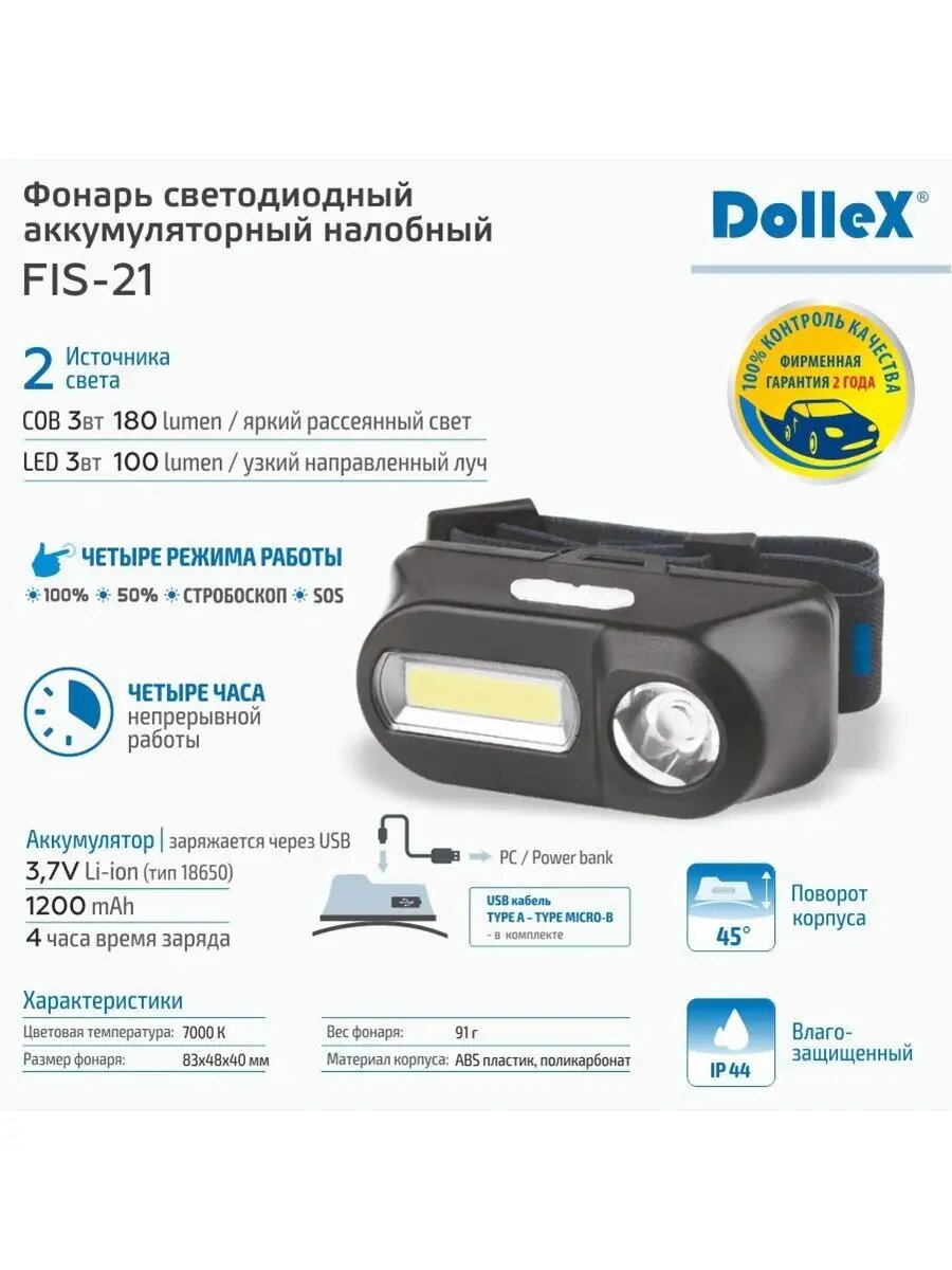 DOLLEX FIS21 фонарь светодиодный аккумуяторный наобный DOLLEX 6 030 ₽