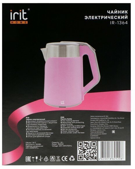 Чайник электрический Irit, IR-1361, 1.8 л, 1500 Вт, скрытый нагревательный элемент, металл
