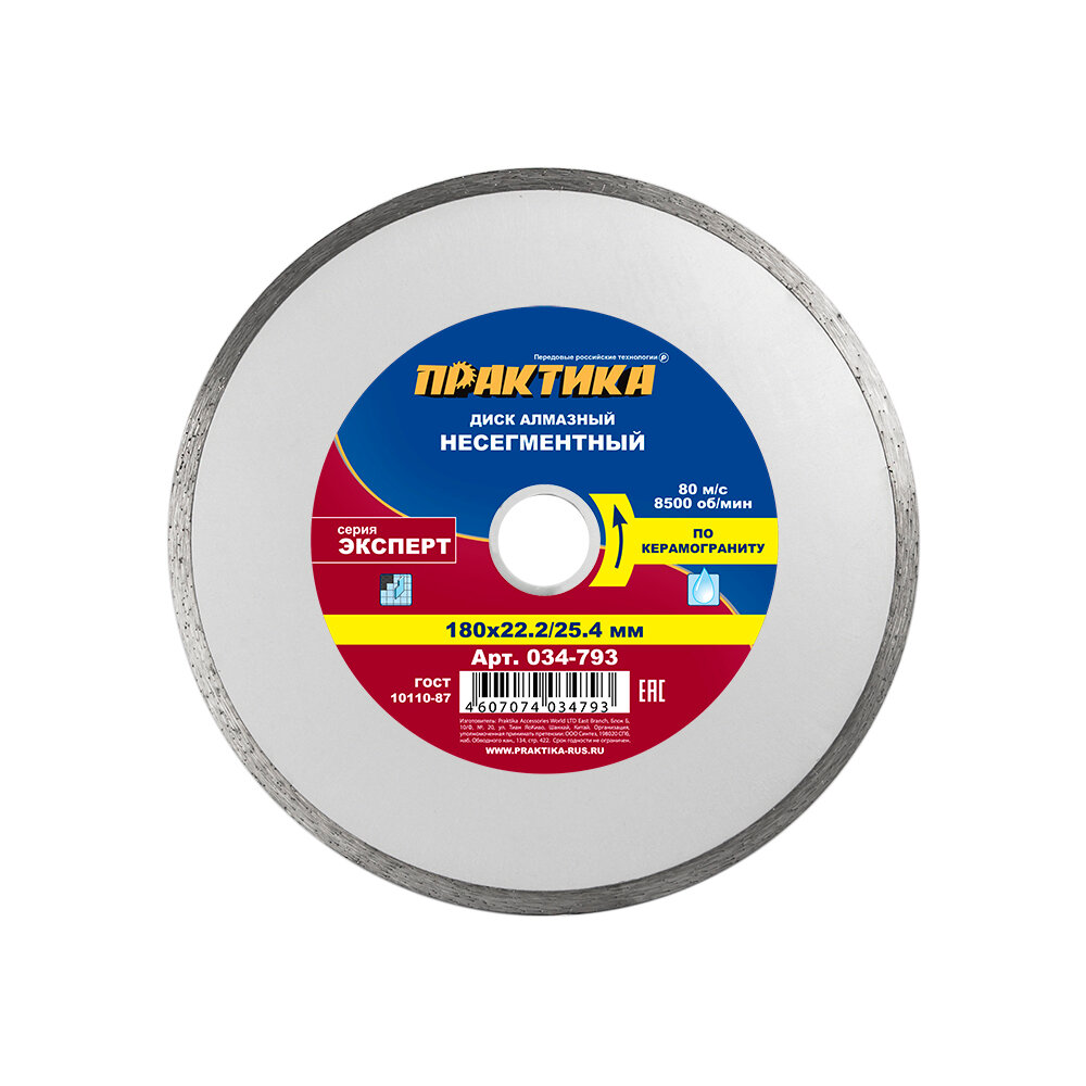 Диск алмазный несегментный "Эксперт-керамогранит" 180 х 22/25,4 мм, (1 шт.) коробк ПРАКТИКА 034-793