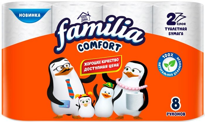 Туалетная бумага Familia эконом белая двухслойная, 8шт радуга/