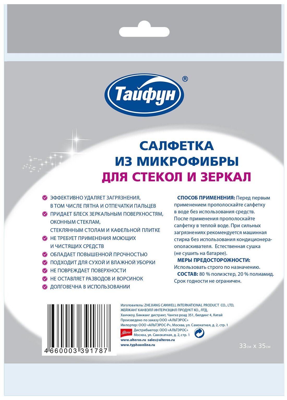 Салфетка «Тайфун» для стёкол и зеркал, микрофибра, 33 х 35 см информация: