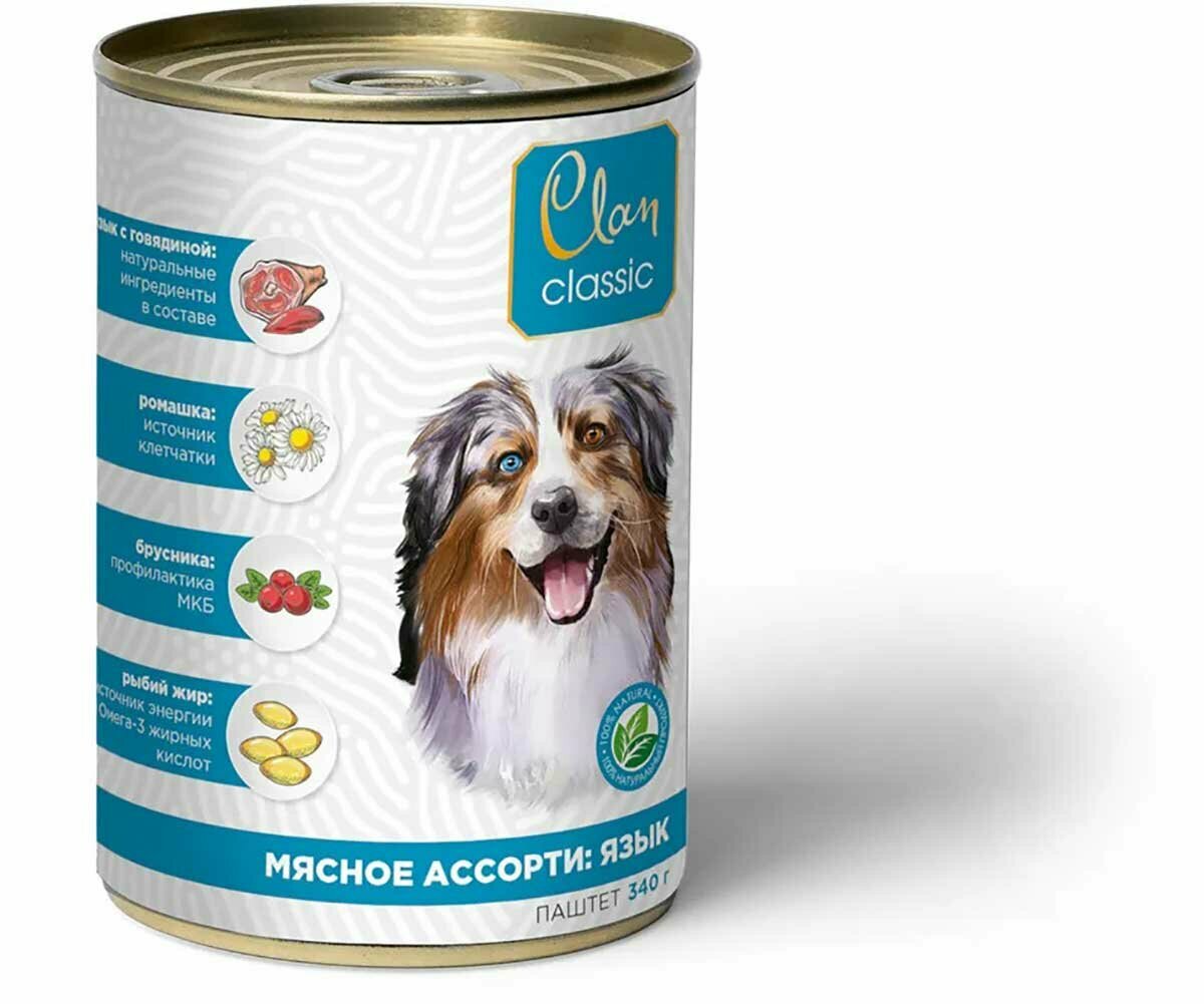 Корм полнорационный консервированный Clan CLASSIC для собак, Мясное ассорти с языком, 340г, 6 шт.