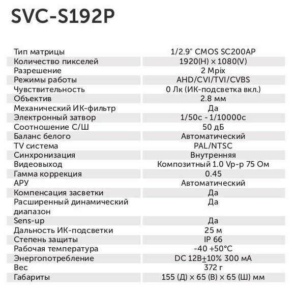 AHD-видеокамера Satvision SVC-S192P 2 Mpix 2.8mm информация: