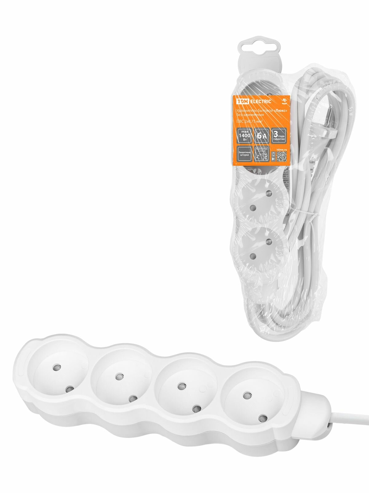 Удлинитель бытовой "Люкс" УЛ4 4 гнезда, 3м, б/з, с з/ш, ПВС 2х0,75 мм2 10А/250В бело-серый TDM информация:
