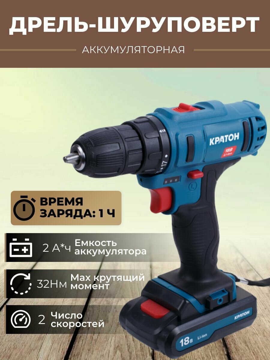 Аккумуляторная дрель-шуруповерт Кратон CDB-18-Li-1,5 Li-Ion 1.5 А·ч 18.0 В х1 коробка 32 Н·м