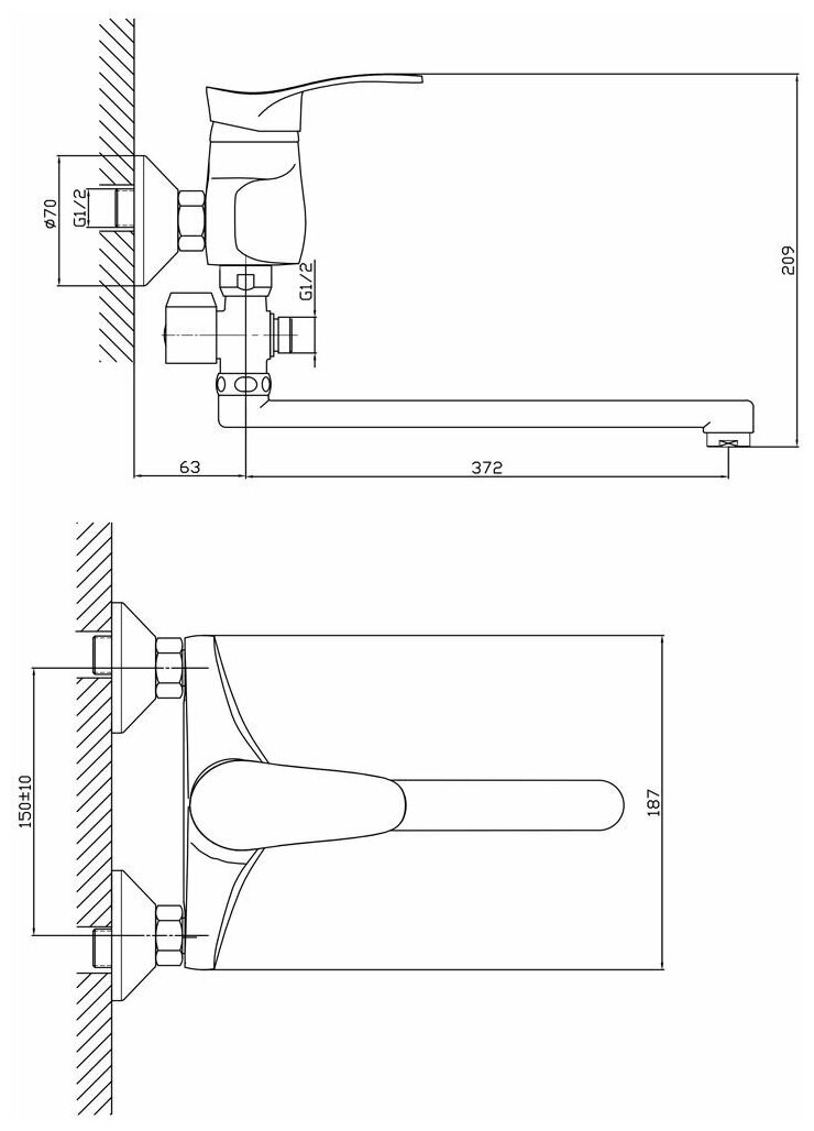 Смеситель на раковину настенный Эверест B46-350 с круглым поворотным изливом, кран-буксы 1/2", хром