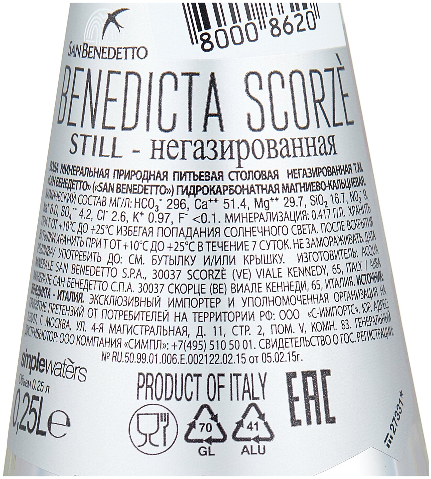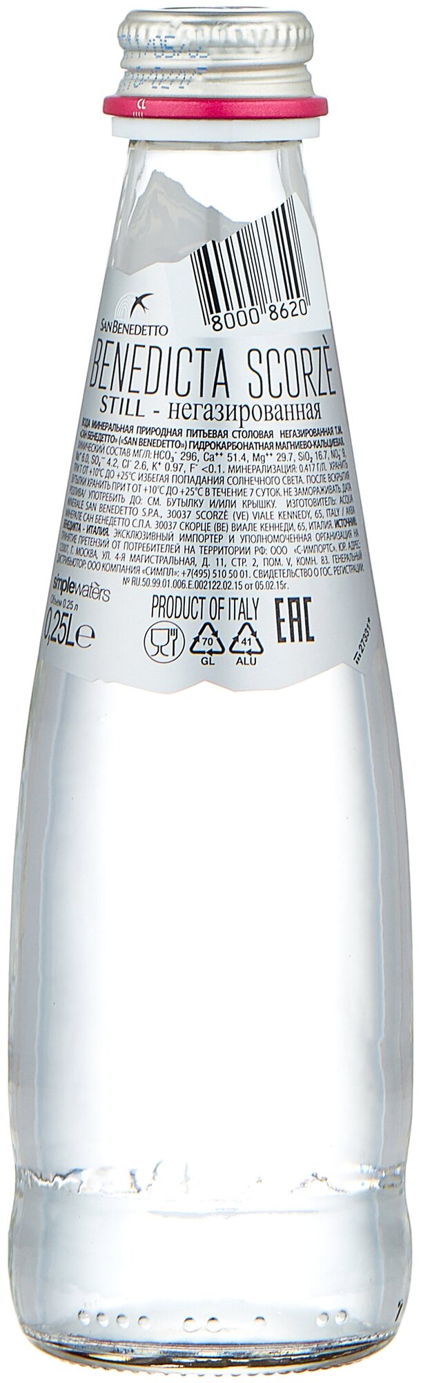 Вода минеральная San Benedetto 0,25л негаз. стекло 24 шт/уп информация: