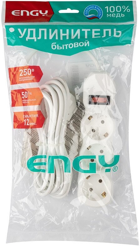 Отзывы на Удлинитель с выключателем Engy Гранд, ПВС 3 x 0,75 мм, с заземлением, 3 розетки, 5 м, белый