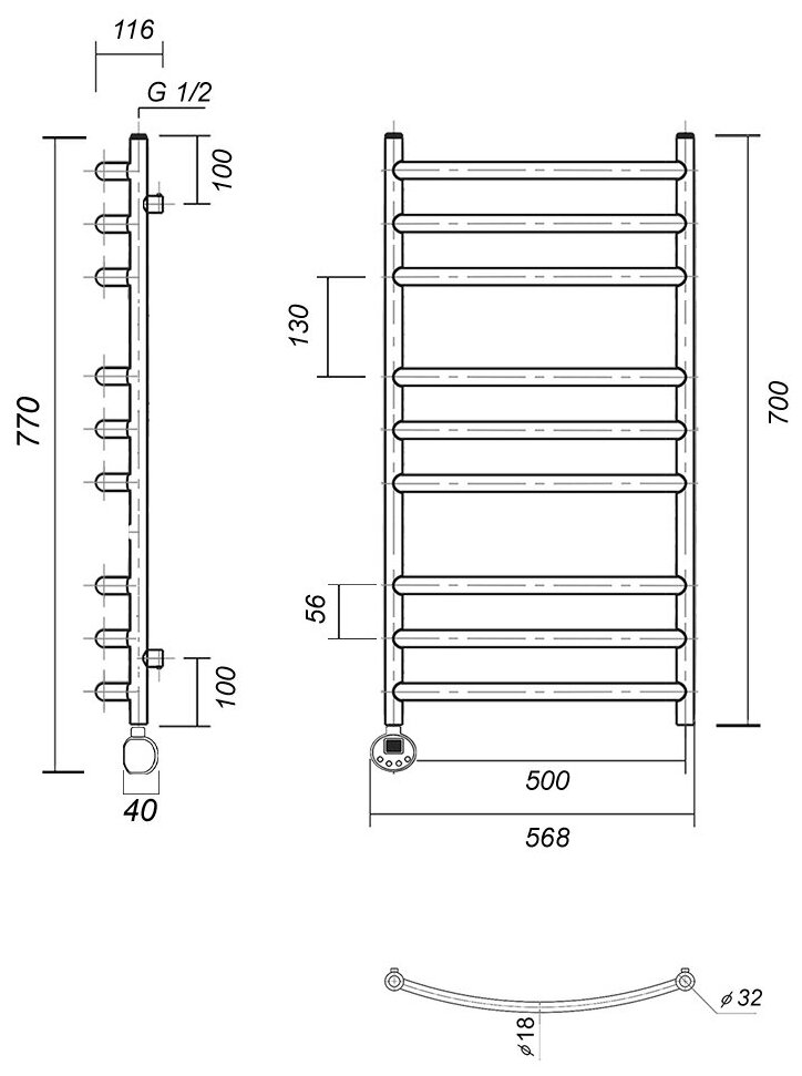 | Дополнительная информация | Полотенцесушитель с ТЭНом в сборе 1 шт., Стойка крепления 4 шт., Кран Маевского - 1 шт. Заглушка - 1 шт. Паспорт/инструкция |