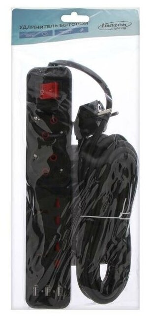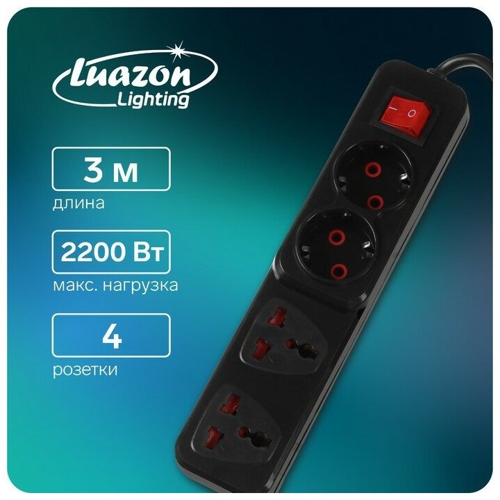 Luazon Lighting Удлинитель Luazon Lighting, 2 евро+2 унив.роз., 3 м, 2200 Вт, 2х0.5 мм2, с выкл.,черный информация: