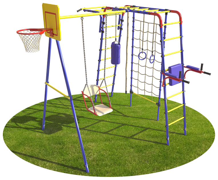 | Комплектация | 2 шведские стенки, Рукоход, Качели, Кольца, Канат, Турник с рукоходом (регулируемая высота крепления), Брусья+пресс откидные со спинкой, Баскетбольное кольцо с щитом и сеткой, Груша боксерская детская, Сетка для лазания |