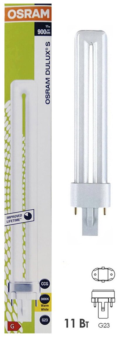 Лампа Люминесцентная Dulux 11W 220V G23 CFL S 900Лм 3000К D-12mm L-237mm Энергосберегающая Свет Теплый белый OSRAM, уп. 10шт