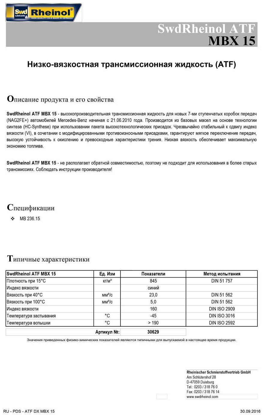 SWD RHEINOL 30629,580 Транс. масло ATF MBХ 15 (5л) информация: