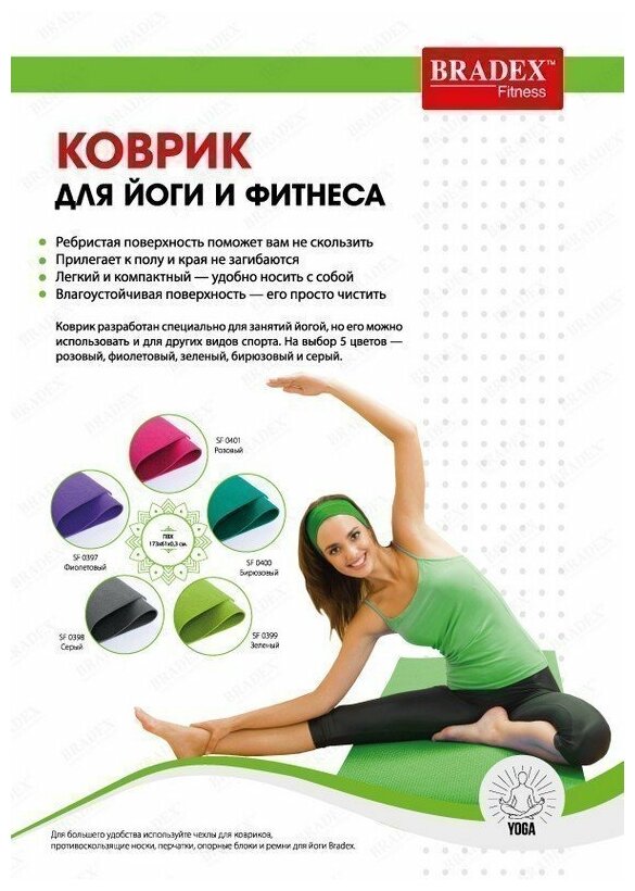 Коврик для йоги и фитнеса, Bradex (товары для спорта и отдыха, зеленый, 173 х 61 х 0,3, SF 0399) 1 380 ₽