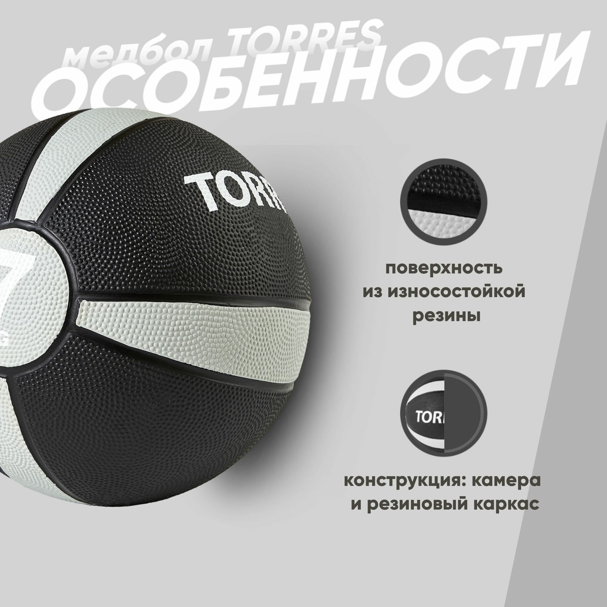 Медбол TORRES 7 кг, арт. AL00227, резина, диаметр 23.8 см, черный-серый-белый