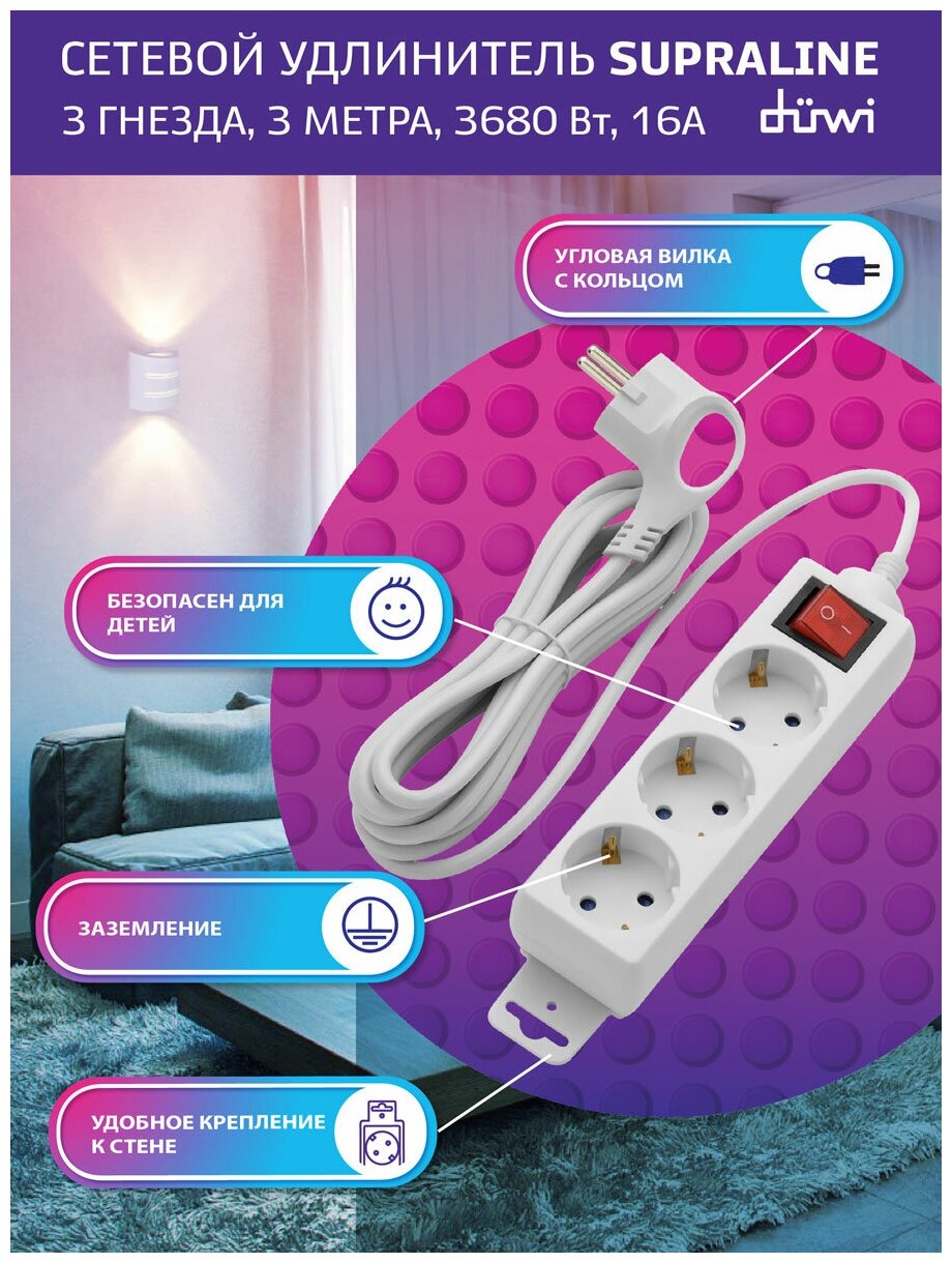 Удлинитель с заземлением duwi с выкл. Supraline 3 розетки, 3 метра, 3х1,5мм2, 3680 Вт, 16А, 32058 6