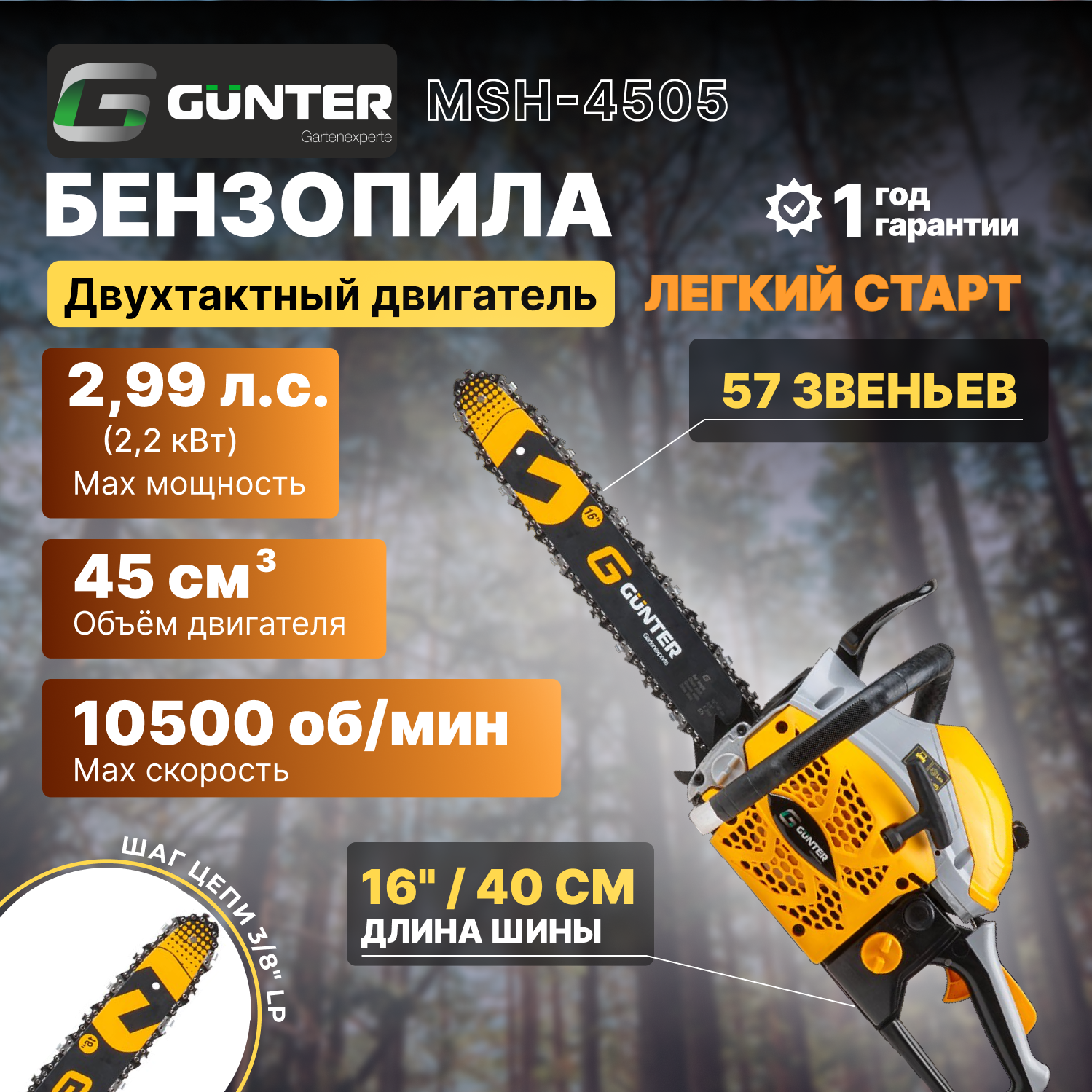 Отзывы на Бензопила Gunter MSH-4505 шина 40 см (16''), 3/8" LP, 1,3 мм, 57 зв. (2.20 кВт, 2.95 л.с., 45 см3, вес 7 кг) (GUNTER) (MSH-4505)