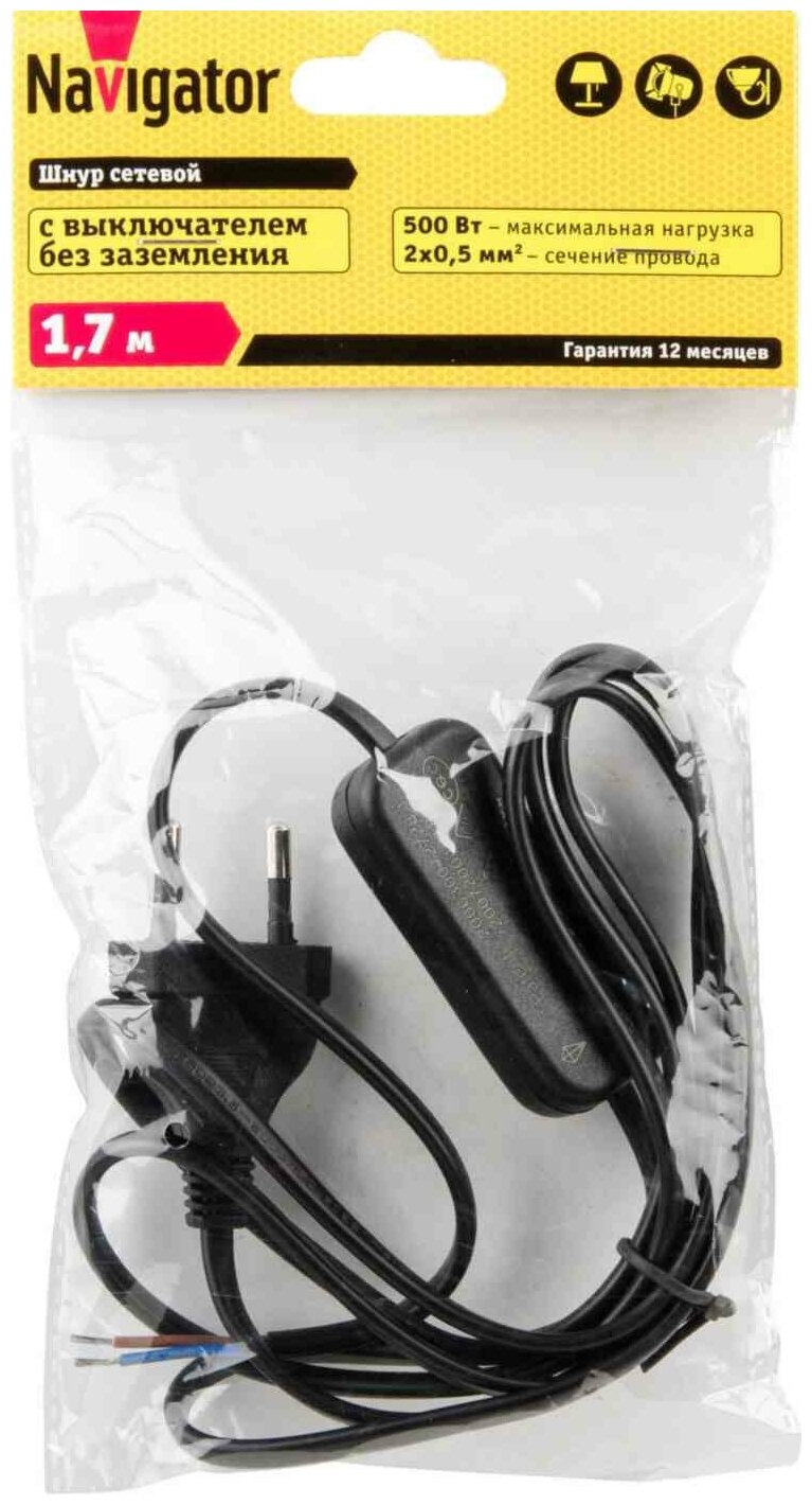 Шнур Navigator 61 720 NPS-FS-170-2x0.5-BL 1.7м с выкл. черный информация: