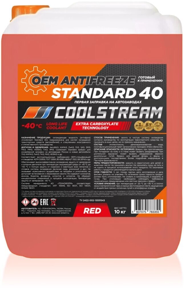 Антифриз CoolStream Standard G12 -40°С красный 10 кг информация: