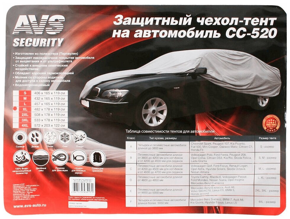 Защитный чехол-тент на автомобиль AVS СС-520 "XL" 482х178х119см (водонепроницаемый) информация:
