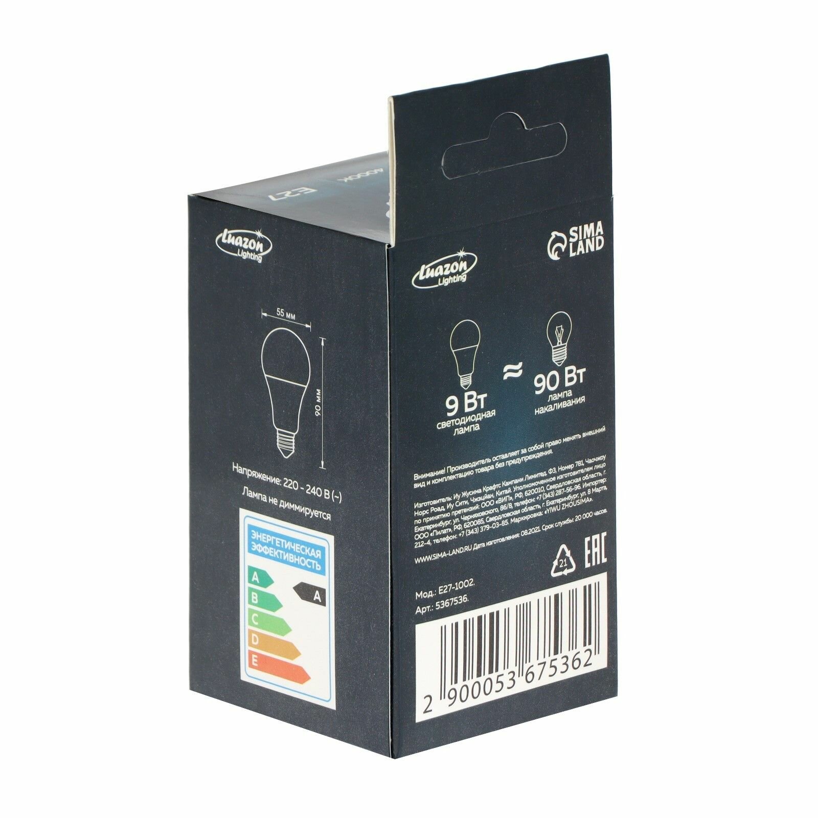 Лампа cветодиодная Luazon Lighting, A55, 9 Вт, E27, 780 Лм, 4000 К, дневной свет информация: