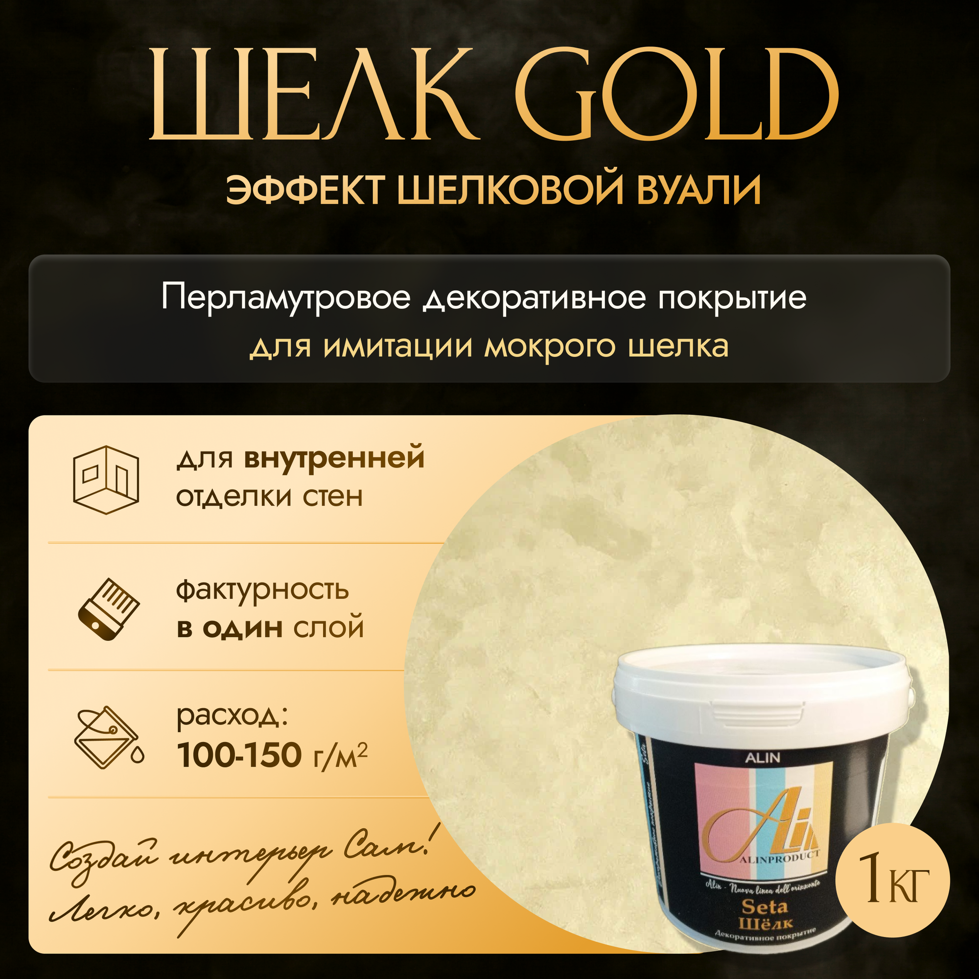 Краска, Декоративное покрытие ALINPRODUCT Шелк Сета Seta база золото - перламутровая декоративная штукатурка для имитации мокрого шелка Акриловая, Фактурная, *Декоративная, Глянцевое покрытие, 1 кг, золотистый