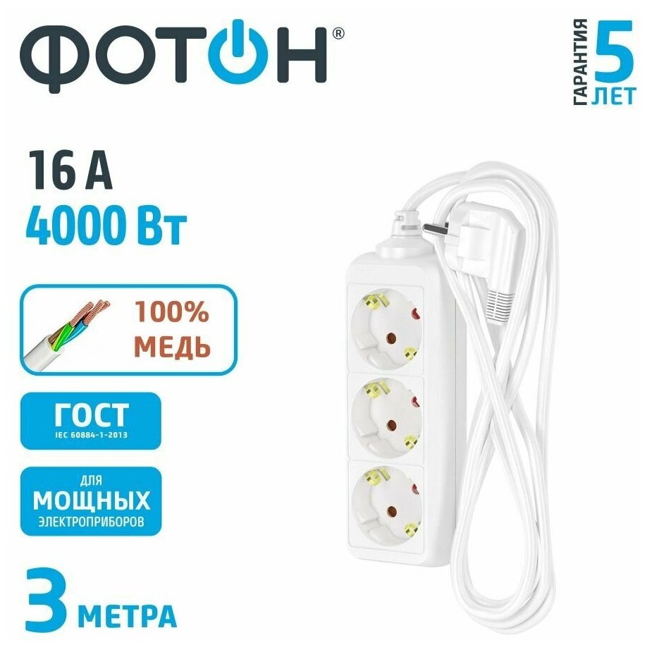 Отзывы на Удлинитель фотон 16-53ЕS, 3 розетки, 5 м, с/з, 16А / 4000 Вт белый